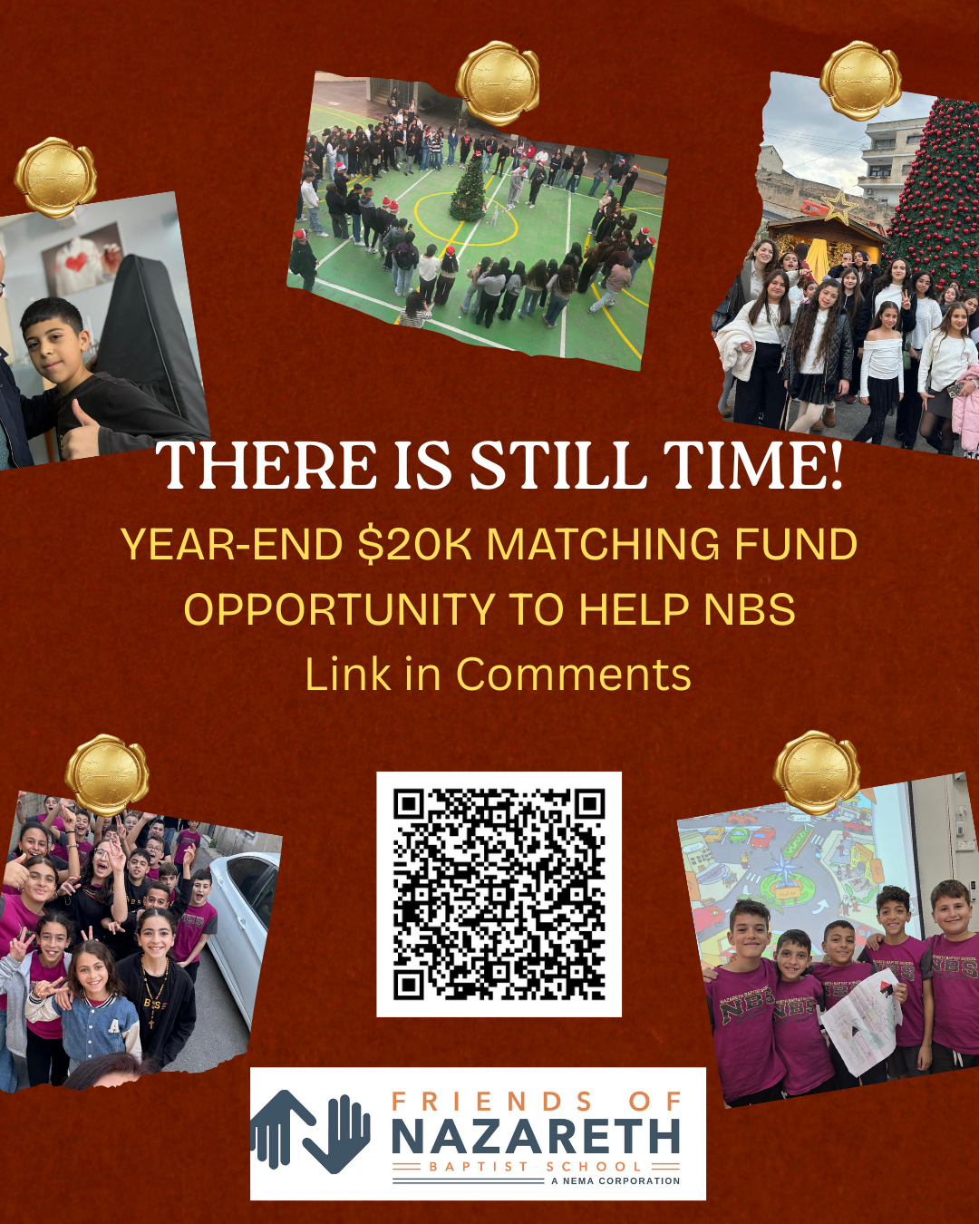 There is still time!! Sadly we came up short on our #GivingTuesday match but we have another opportunity to have your gifts MATCHED dollar for dollar up to $20,000 until the year’s end. Friends of Nazareth is committed to helping the Nazareth Baptist School and her students complete each of the ‘projects’ still needing to be addressed. Your gifts given before the end of 2025 will help FON/NBS finish these projects on our campus. You are also helping us share about the greatest gift ever…our Lord and His Grace. Don’t hesitate to reach out to us if you have questions about the nature of these projects. Thank you!!